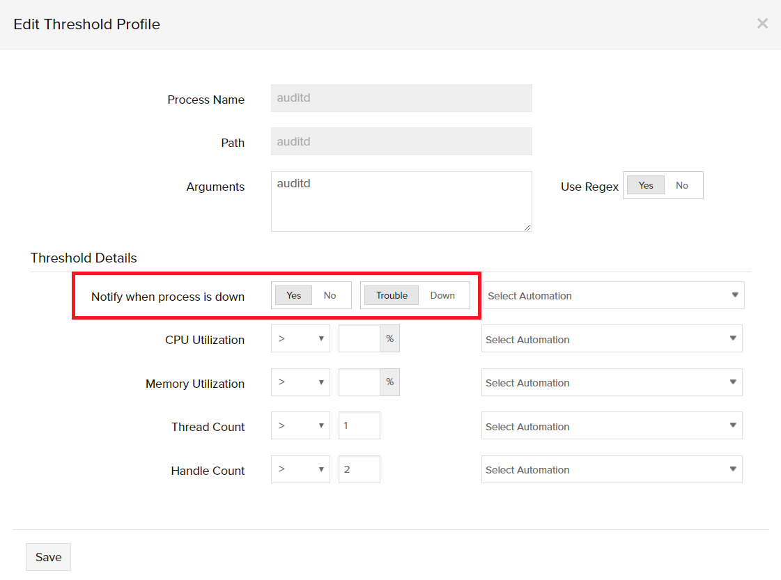 - Select Yes for the option Notify when process is down. You can also choose to opt for a TROUBLE or DOWN alert.