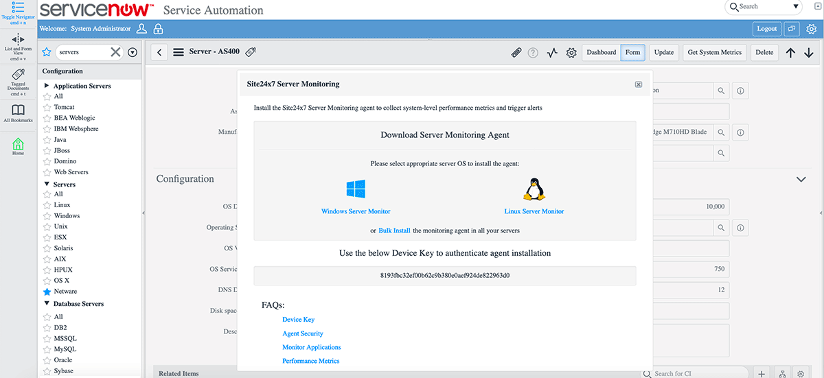 Once you have added the Site24x7 app from the ServiceNow store and created an account in Site24x7, install the Site24x7 Server Monitoring agent (Windows/Linux) and get started with monitoring your servers and applications without switching tabs.