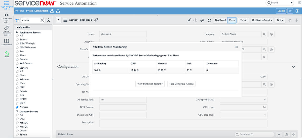 Using the system metrics provided by Site24x7, IT personnel can know the CPU, disk, and memory utilization of servers within their ServiceNow console in a single click.