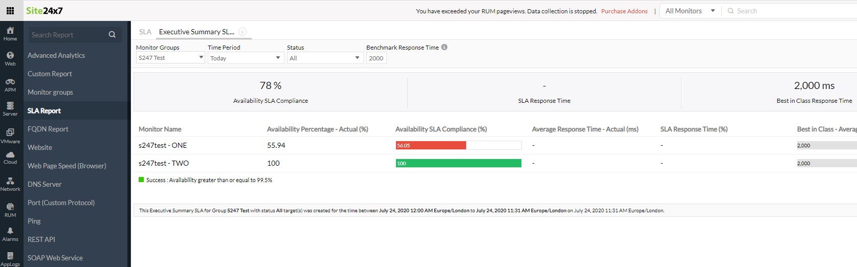 Can you check our our Executive Summary SLA report and check if it suites your need. Executive Summary SLA report gives you an outlook into your overall availability and response time SLA on a monitor group level.