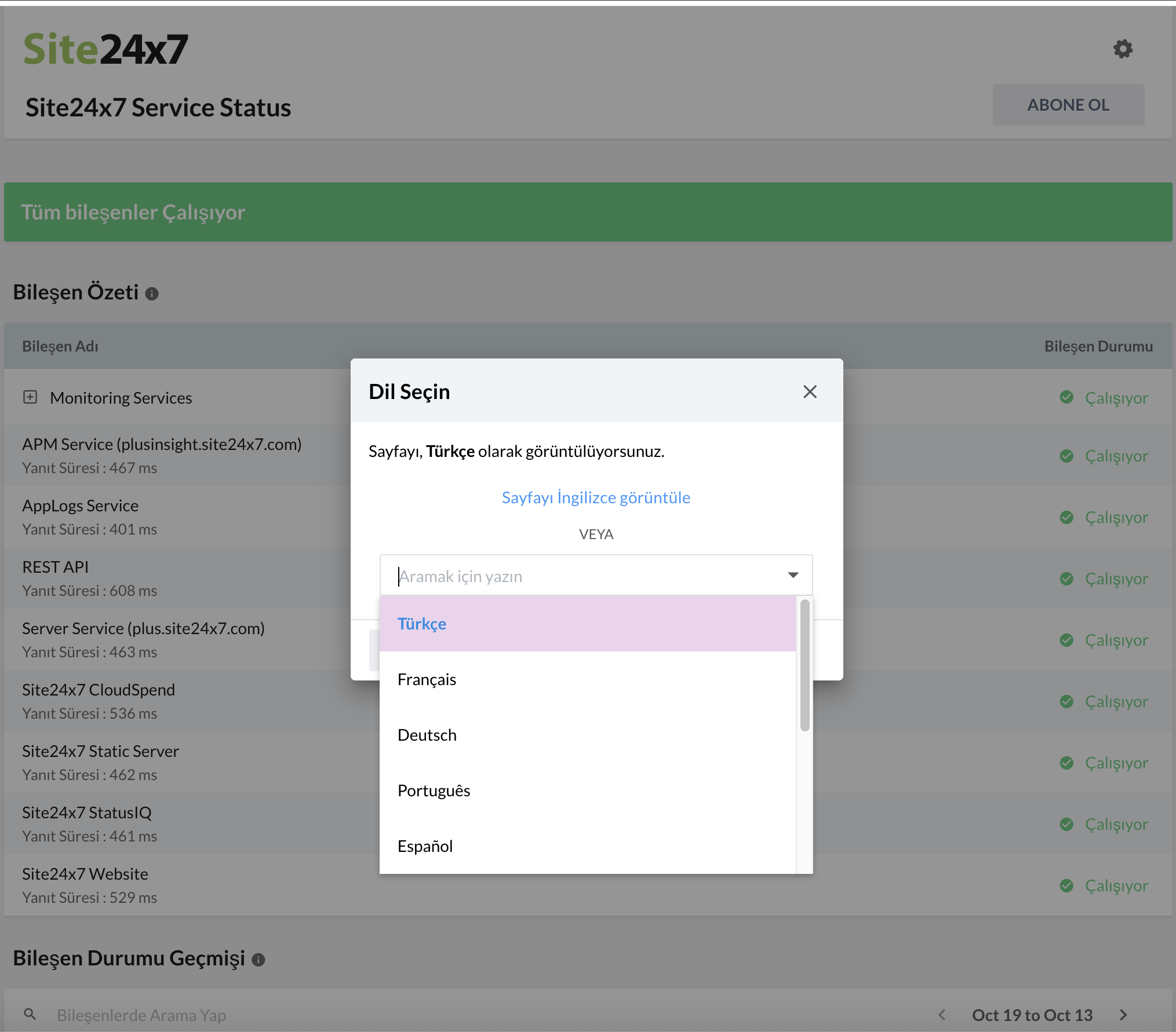 Turkish language support is now available for the status pages. Do let us know the quality of the translation.