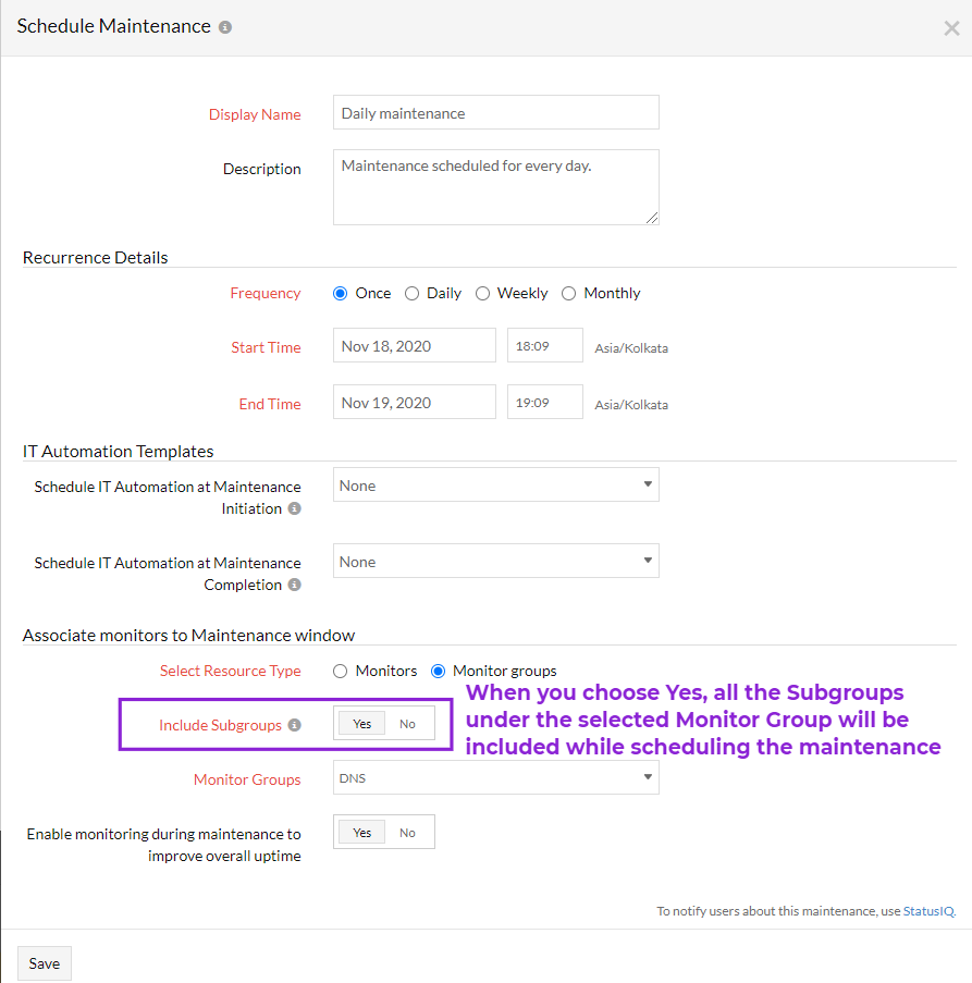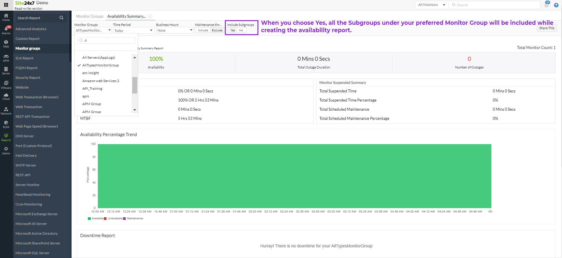 For example, while scheduling an Availability Summary report to be sent, you can toggle Yes for the option Include Subgroups. This would ensure that Subgroups of the selected monitor groups are also included.
