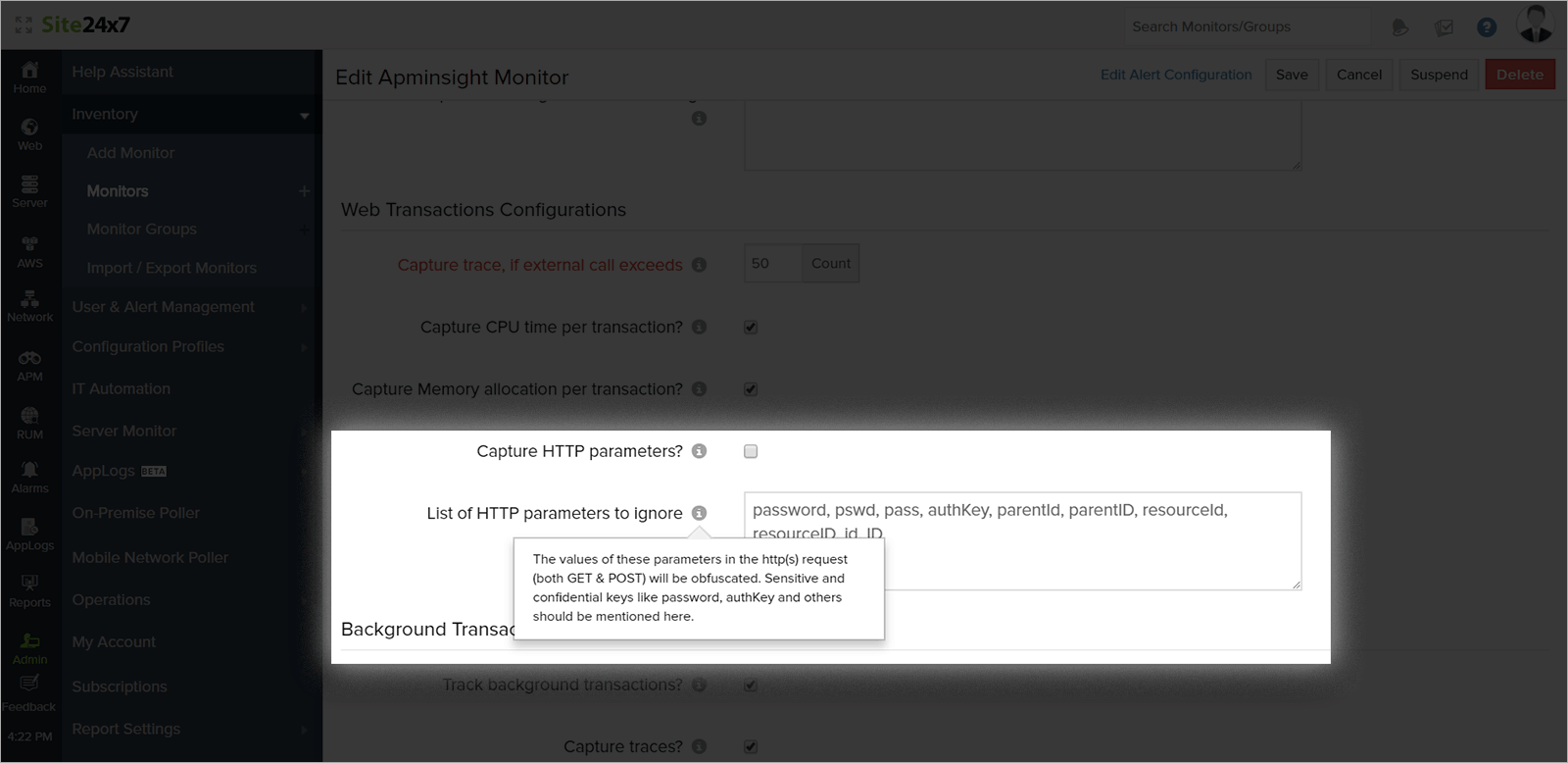 To view HTTP parameters, enable Capture HTTP parameters under the Web Transactions Configurations in Agent Configurations. You can view these attributes under the Traces tab.