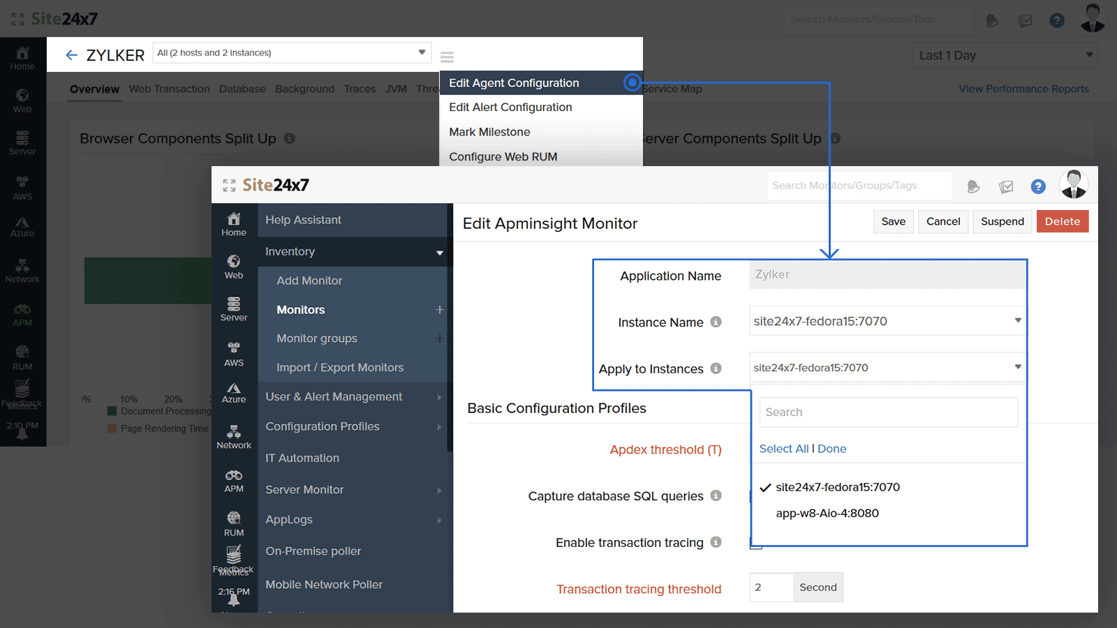 To change your instance configurations, click Edit Agent configuration in APM Insight. Click Select all if you want to apply the same configuration to all instances, or choose specific instances as needed.
