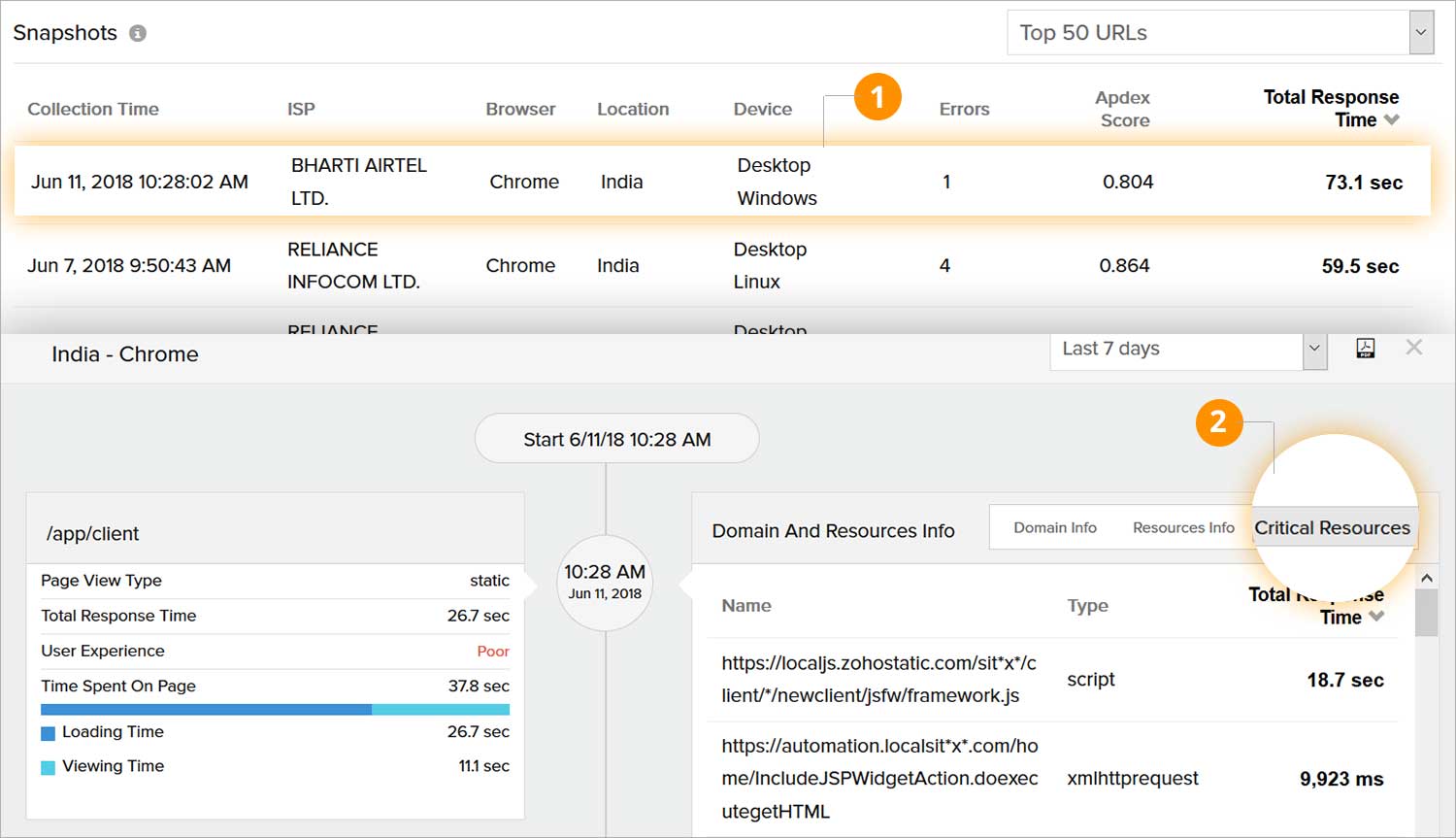 Clicking on a particular snapshot displays all the webpages accessed during that particular session, sequentially. For every URL, resources with the maximum response time are displayed under Critical Resources. With detailed information about your webpage resources, you can pinpoint issues to the exact conditions they arose from.