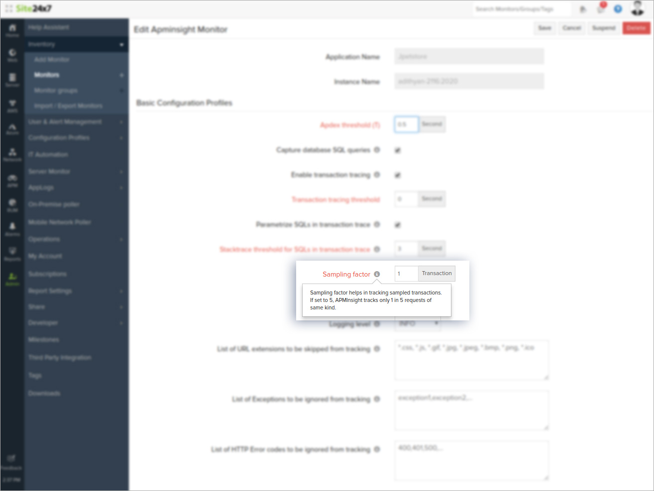The sampling factor helps monitor transactions based on a set frequency. When set to five, one in every five similar transactions is monitored. You can adjust this number based on your requirements.