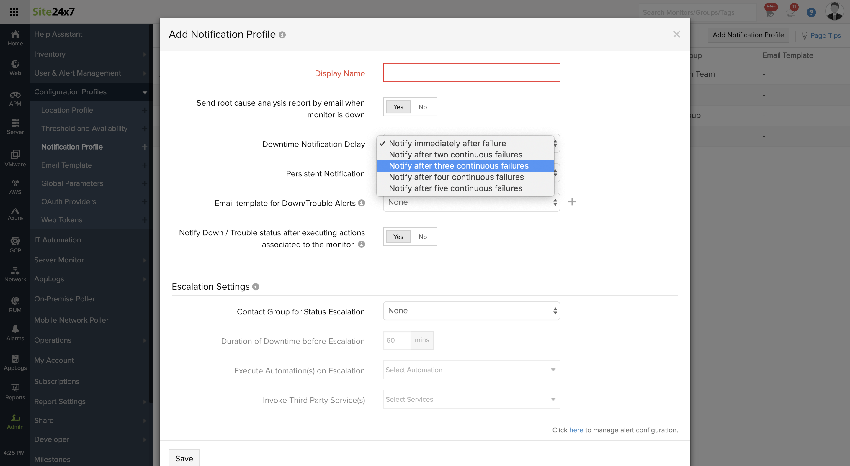 We’ve tried our best to engineer Site24x7 so that it doesn't send users any false alerts. However, you would want to delay notifications to you till any home grown scripts that you may have deployed also does not fix the problem. In such scenarios, you can use notification delays.