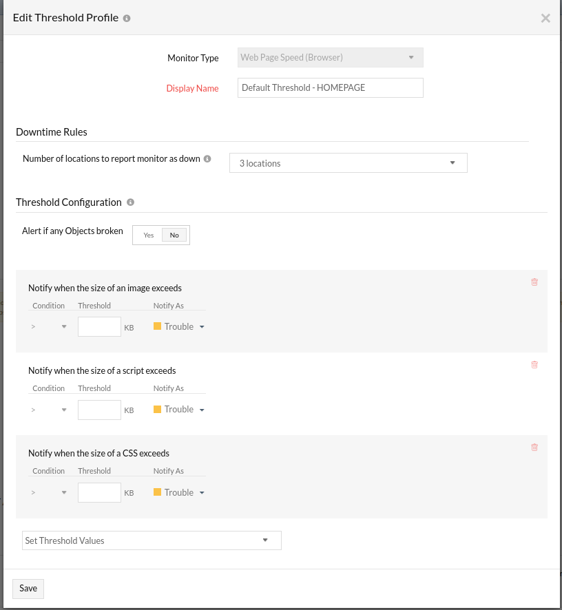 We want to use the WEB PAGE SPEED to monitor a newspaper article page. We saw we can configure a threshold for the TOTAL IMAGES SIZE of the page a configure a % of variance. The problem is we need to monitor PER IMAGE size. Because an article can have a photo gallery and we need to consider a total size of, let's say, 5MB, but if 1 of the images is over 200k then we have a performance problem. So, 1 article with 10 images of 200k is ok, but 1 article with 1 image of 1MB is not.