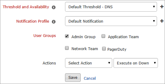 - Actions: Select an action to be executed when DNS is down/trouble/up/any status change/any attribute change. The defined action gets executed when there is a state change and selected user groups are alerted.