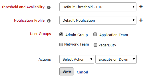 - Actions: Select an action to be executed when the FTP service is down/trouble/up/any status change/any attribute change. The defined action gets executed when there is a state change and selected user groups are alerted.
