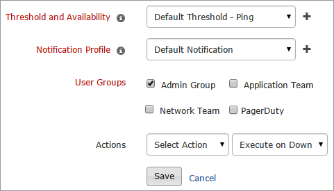 - Action: Select an action to be executed when the ping service is down/trouble/up/any status change/any attribute change. The defined action gets executed when there is a state change and selected user groups are alerted.