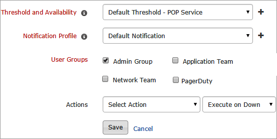 - Actions: Select an action to be executed when the POP service is down/trouble/up/any status change/any attribute change. The defined action gets executed when there is a state change and selected user groups are alerted.