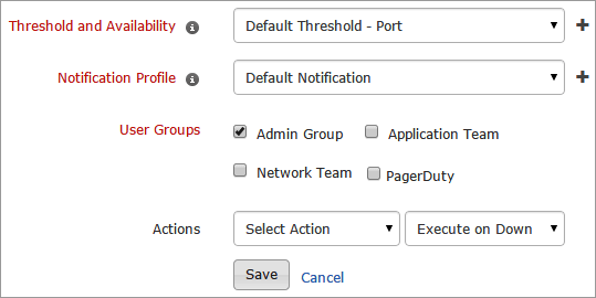 - Actions: Select an action to be executed when the port is down/trouble/up/any status change/any attribute change. The defined action gets executed when there is a state change and selected user groups are alerted.
