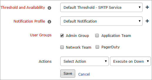 - Action: Select an action to be executed when the SMTP service is down/trouble/up/any status change/any attribute change. The defined action gets executed when there is a state change and selected user groups are alerted.