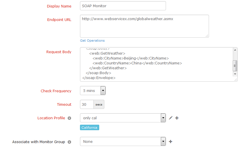 - Endpoint URL: Type the SOAP web service endpoint URL which needs to be monitored. Click Get Operations to set-up and initiate the SOAP Wizard.