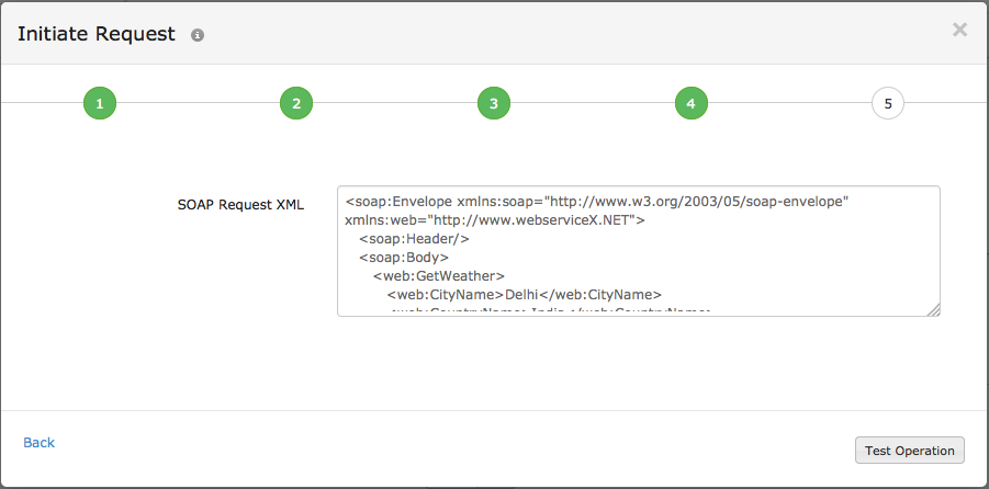 - Initiate Request: Click Test Operation to validate the SOAP Request XML.