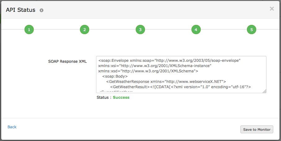- API Status: At one time the SOAP Response XML is successfully validated, click Save to Monitor to add the request XML data to the Request Body.