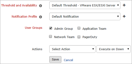 - Actions: Select an action to be executed when the VMware ESX/ESXi is down/trouble/up/any status change/any attribute change. The defined action gets executed when there is a state change and selected user groups are alerted.