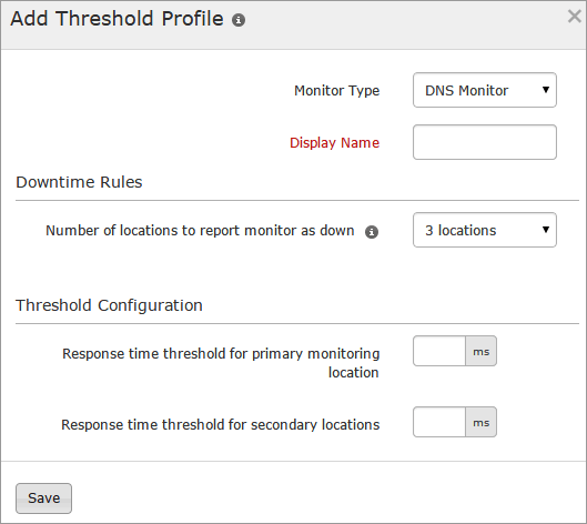 Number of locations to report monitor as down: Choose from the drop down to receive alert notification when the Domain Name Server is down from specified number of locations.