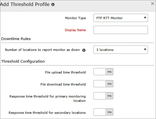 A default threshold and availability profile for FTP RTT monitor will be automatically listed in Threshold and Availability screen when the users for the first time click Admin > Inventory > Monitors > Add Monitor > FTP RTT Monitor.
