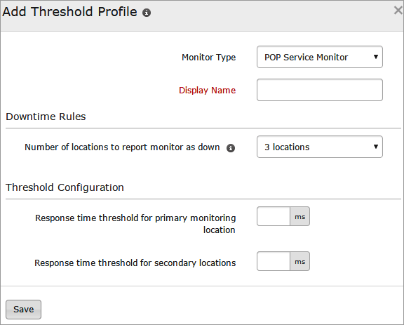 A default threshold and availability profile for POP Service will be automatically listed in Threshold and Availability screen when the users for the first time click Admin > Inventory > Monitors > Add Monitor > POP Service.