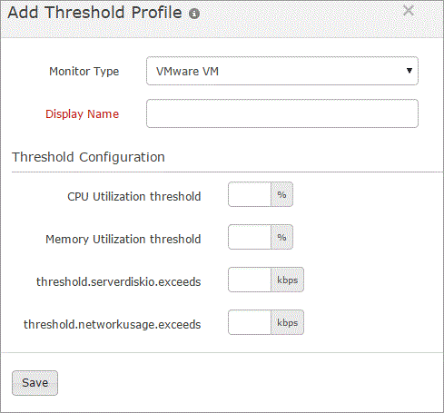 A default threshold and availability profile for VMware VM Monitor will be automatically listed in the Threshold and Availability screen when the users for the first time click Admin> Inventory > Monitors > Add Monitor > VMware VM.