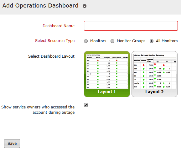 - Select Resource Type: Select the required monitors or monitor groups from the dropdown list for which you need a dashboard view for.