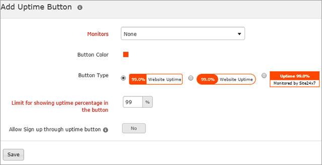 - Allow SignUp through uptime button: Check the option to allow website visitors to sign-up for Site24x7 service through the Uptime Button. Site24x7 will provide a link to our sign up page when the visitors click the Uptime Button.
