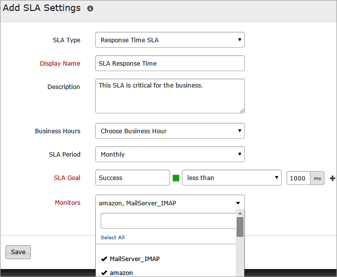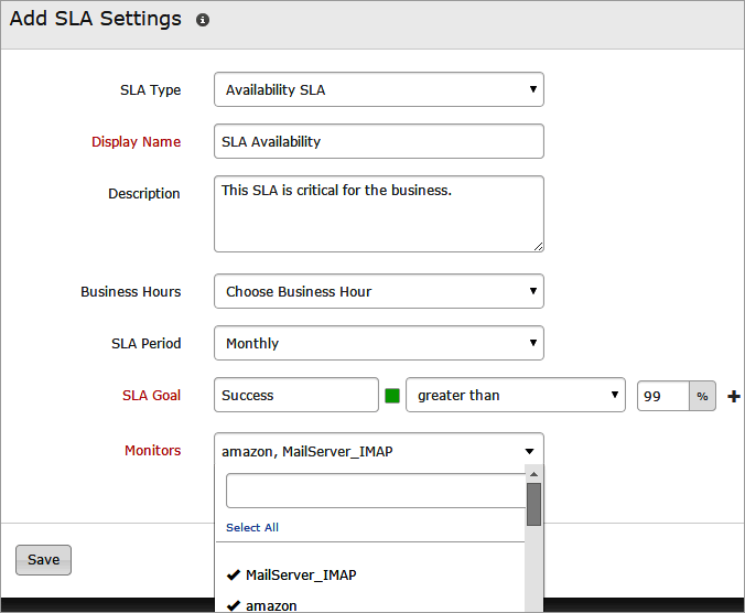 - Monitors: Select the required monitors from the drop down to associate SLA to these monitors.