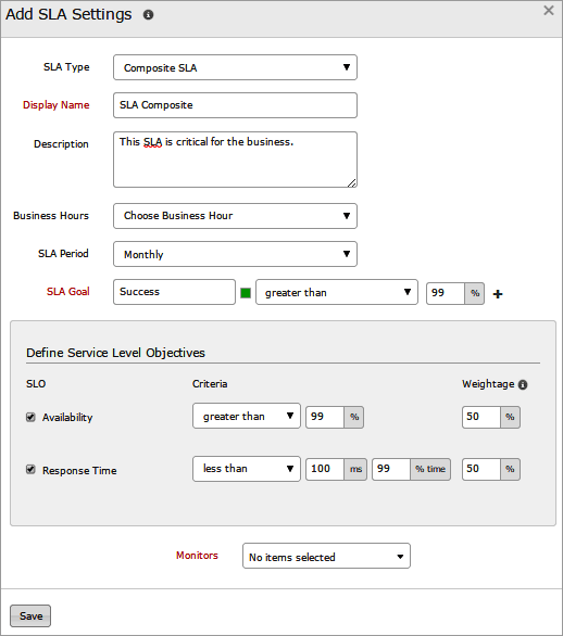 - Composite SLA: Defines both the availability and response time SLAs under a single monitoring parameter.