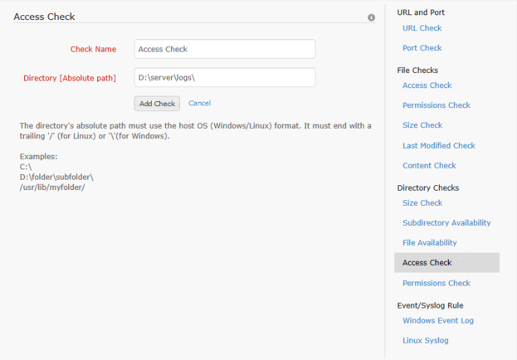 This allows the user to monitor a directory and be notified when it is accessed for any reason. The absolute path to the directory to be monitored is configured in the directory access check. When this check is applied to the server monitor, the directory is watched for access. When accessed, the alert is raised and the monitor goes to trouble status from up. The status is unaffected if the monitor status was previously trouble or down. The trouble status is maintained for one poll duration after which the status of the monitor is reset to up. If access check is applied to a file/directory which is already being watched in polled checks [content check, size check], then it will keep on notifying every 5 mins as those files/directories are accessed to perform polled checks data collection.