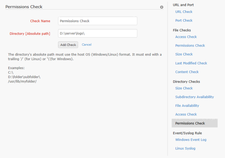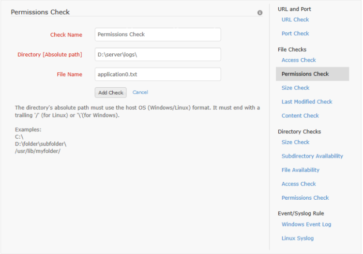 The user can monitor whether the permission of a file has been modified by configuring this check. To configure the permissions check for a profile, the check name, path to the file and the file name have to be given. The file name supports regular expressions [For information on regular expressions click here]. Once this check is associated with a server monitor, the user will be alerted if the specified file's permission attributes change. This alert causes the monitor to switch from Up to Trouble status, if it isn't already in trouble or down state. For permissions check, the trouble status will be maintained for one poll duration. After that the monitor status is changed back to up.
