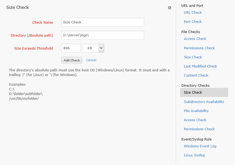 The directory size check is used to notify when a directory on the server file system exceeds a size threshold. To configure this check, the check name, the path to the directory to be monitored and the size threshold with unit must be given. The size unit conversion used is as follows -