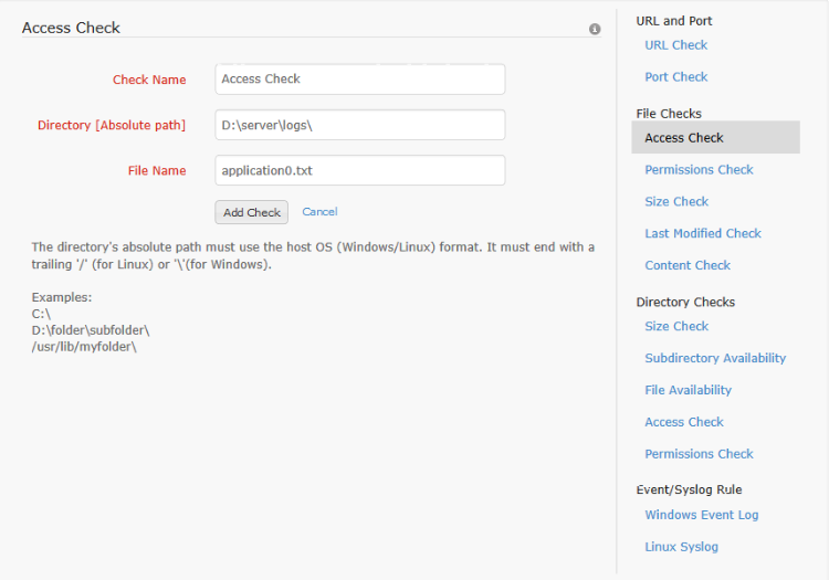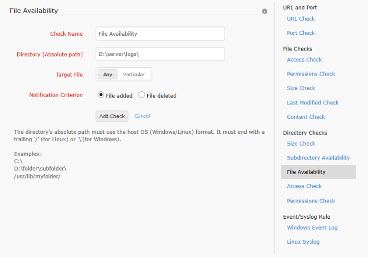 The file check is similar to the subdirectory check. The file check is applied to files instead of folders within a directory. Here too, the user has the option to watch for either all the files or a particular file [file name supports regular expressions] within the specified directory. Addition or deletion event can be monitored. When the file(s) is added/deleted, as per the configured check, the alert is sent and the monitor status is set to trouble if the monitor isn't already down or in trouble state.