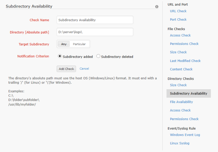 The sub directory check is used to monitor all the sub directories within a monitored directory. The user has the option to monitor all the sub directories or a particular sub directory [subdirectory name supports regular expressions] under the specified directory. The user can watch for the addition or deletion of the sub directory. The alert is raised when the configured event occurs and the monitor status is set to trouble if it isn't already in trouble or down state].