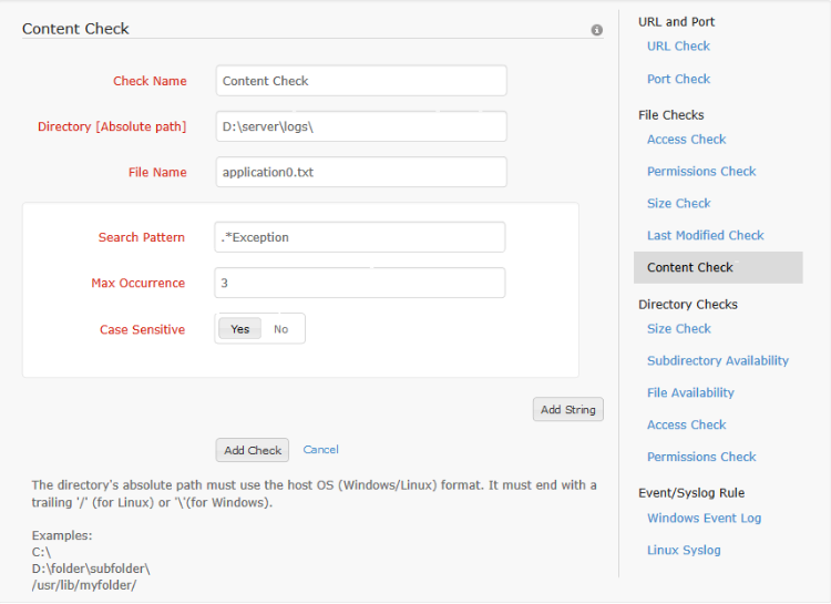 Content check is used to search a file for some text/content. The absolute path to the directory containing the file and the file name are given. Also, one or more search strings are configured for the check. For each search string, the search pattern, maximum occurrence and case sensitivity parameter are configured. The check is added only if at least one search string is configured for the content check. In content check both file name and search pattern support regular expressions.