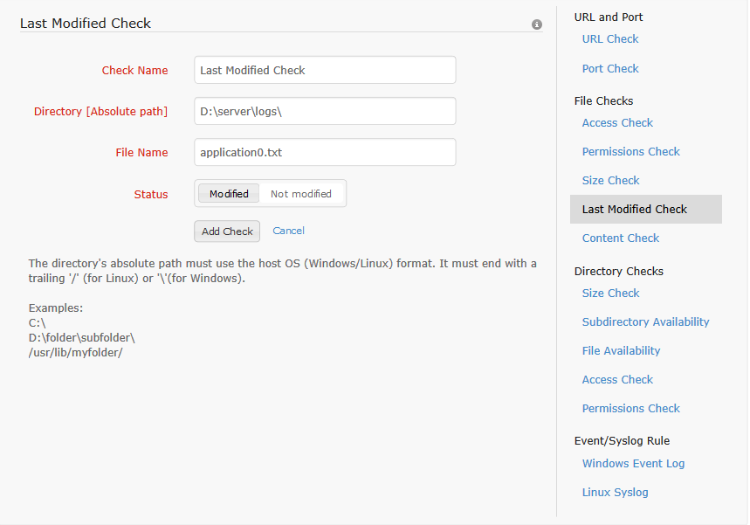 The last modified check can be configured for files. This alerts the user in either of two cases - if the file is modified by a user / if the file is not modified for more than a set period of time. To configure this check, the check name, path to the file, the file name (or regular expressions, and the status of the file for which the alert is to be triggered must be configured. If the status is configured as 'Not Modified', additionally the maximum time duration for which the file can stay unmodified is to be configured. The alert causes the monitor to switch from Up to Trouble status, if it isn't already in trouble or down state. The trouble status is maintained for one poll duration after which the status of the monitor is reset to up.