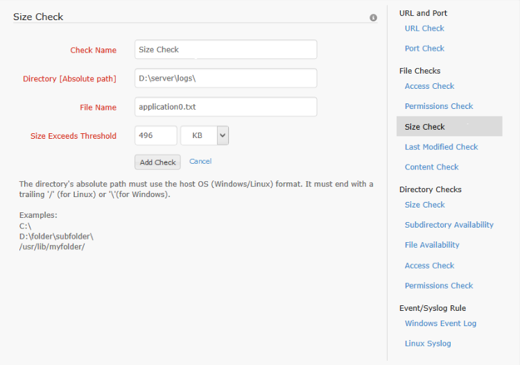 Once this check is configured, the specified file(s) size is checked periodically and an alert is sent when the size exceeds the configured threshold. This alert causes the monitor to switch from Up to Trouble status, if it isn't already in trouble or down state.