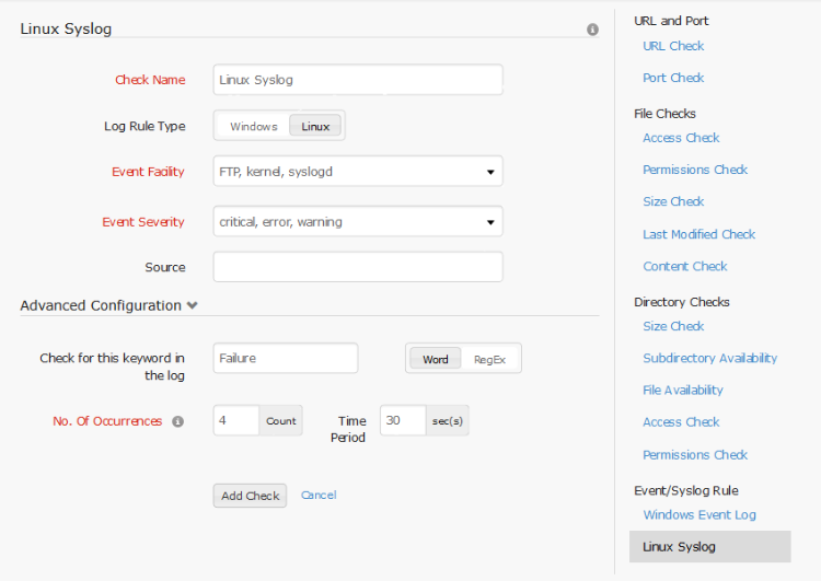 For Linux servers, syslog rule can be configured to filter certain rules. One or more event facility should be selected from Linux standard facilities [kernel, user-level, mail, system, authorization, syslogd, line printer, network news, UUCP, clock daemon, authpriv, FTP, NTP, log audit, log alert, cron, local0, local1, local2, local3, local4, local5, local6, local7]. The event severity level(s) must be selected and the check name must be specified. These are all the compulsory fields in the basic configuration. Optionally, the source can also be configured. In addition to this, some advanced configuration may be setup for the log rule.