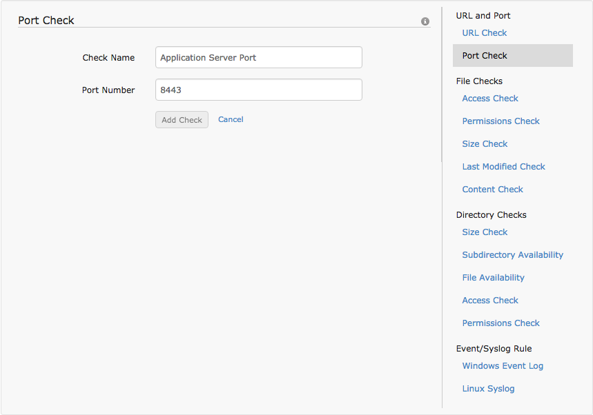This resource check allows the user to monitor ports in a server. The ports to be monitored can range from 0 to 65535. Duplicate ports cannot be added in the same resource profile to avoid redundancy. To add this check to a resource profile, the check name and the port number must be configured add 'Add Check' has to be clicked and the profile has to be saved.