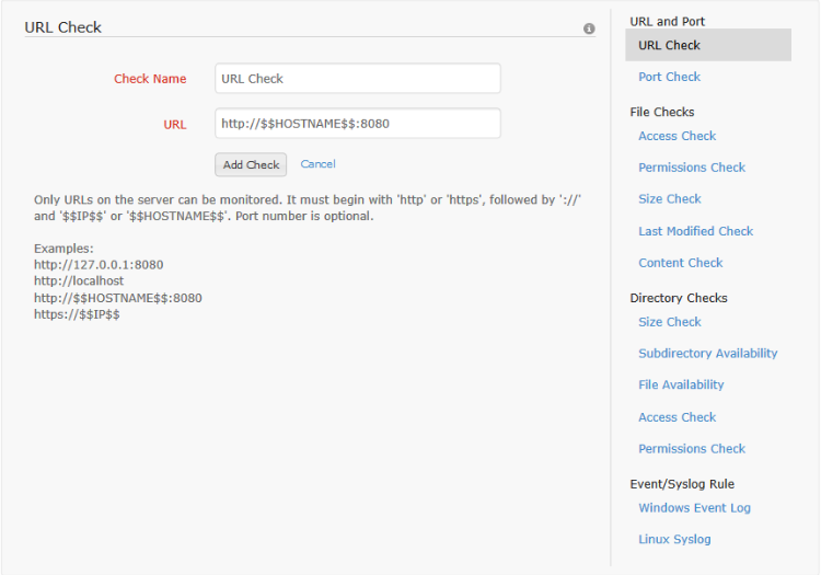 The URL resource check lets the user monitor the availability of a local URL on a server. To configure this, a check name must be given and the URL to be monitored must be entered. The URL value must begin with either http:// or https://. This can be followed by the host name and optionally, the port [https://host:8080]. The host name can be given as localhost or the machine name can be specified. If unsure about the machine name or if the same profile is to be applied to multipe server monitors, then the host name can be denoted as $$HOSTNAME$$. This will be replaced with the respective server host name as needed.