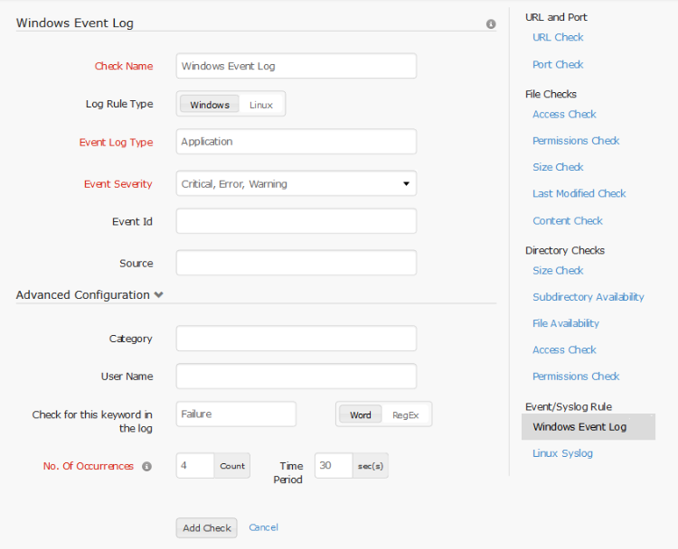 For Windows servers, event log rule can be configured. An event log type should be selected from Windows standard types [Application, Setup, System, Security, Forwarded Events] or a custom (application specific) event log type. Event Severity level(s) must be selected and the check name must be specified. These are all the compulsory fields in the basic configuration. The optional fields are event id, and source. In addition to this advanced configuration may be setup for the log rule.