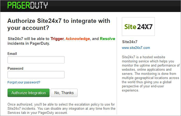Enter your login credentials in the PagerDuty screen and click Authorize Integration to successfully integrate with your PagerDuty account.