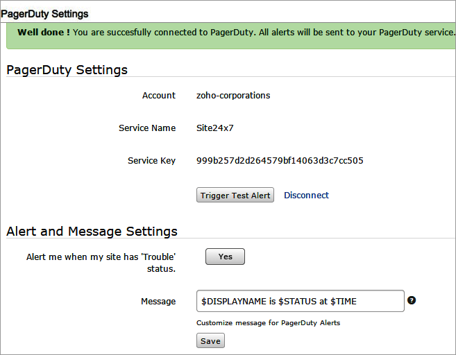 Message: Customize the message with PagerDuty alerts. The default message format will be $DISPLAYNAME is $STATUS at $TIME where $DISPLAYNAME denotes the display name of the Monitor. $STATUS denotes the status of the Monitor when the alert is sent. The status can be Up, Down, Trouble or Maintenance. $TIME denotes the time on when your monitor went down.
