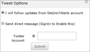 - Twitter: Receive alerts directly on your twitter account. Select the appropriate radio button to receive alerts either via direct message or follow updates from Site24x7Alerts twitter handle.