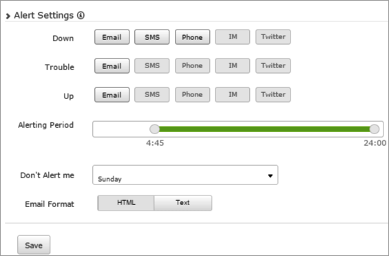 - Down, Trouble, Up: Configure the preferred mode of alerting for Down, Trouble and Up alerts. Choose from different alerting mechanism viz Email, SMS, Phone, IM, Twitter.