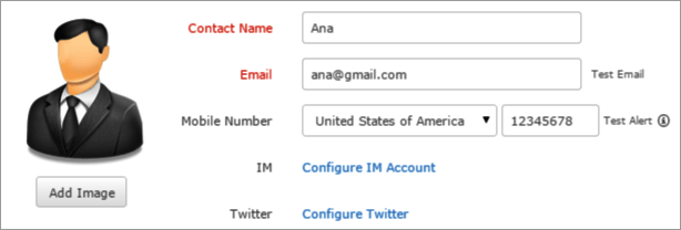 - Mobile Number: Choose the country code from the drop down list and enter the phone number of the contact. The alert notification will be sent to this number if you have opted for SMS as your medium.