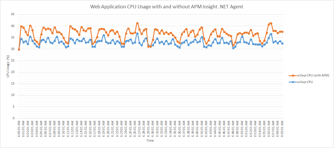 With the default production settings, the APM Insight .NET Agent does not consume more than 5~10 % CPU on average (using default production settings). The CPU usage depends mainly on the number of methods instrumented (using custom instrumentation) and the log level (default is CRITICAL). The maximum consumption will be during the application startup or domain creation, since it involves initializing profiler and loading .NET Agent's libraries. Once initialized, the average overhead due to .NET Agent, remains at around 5% in addition to the normal CPU usage of the web application.