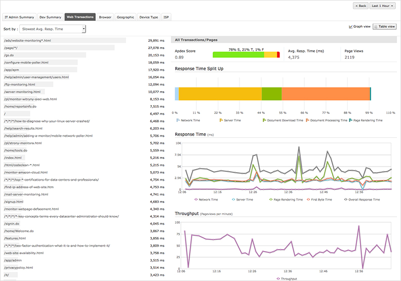 Clicking on Transactions tab displays the response time by each web transaction with graphical representation of both response time and throughput.