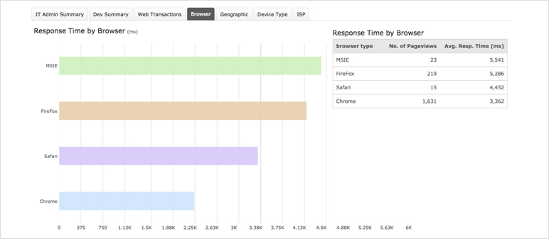 Clicking on the Browser tab displays the avg. response time split by browsers. Details include browser type, no. of requests and avg. response time.